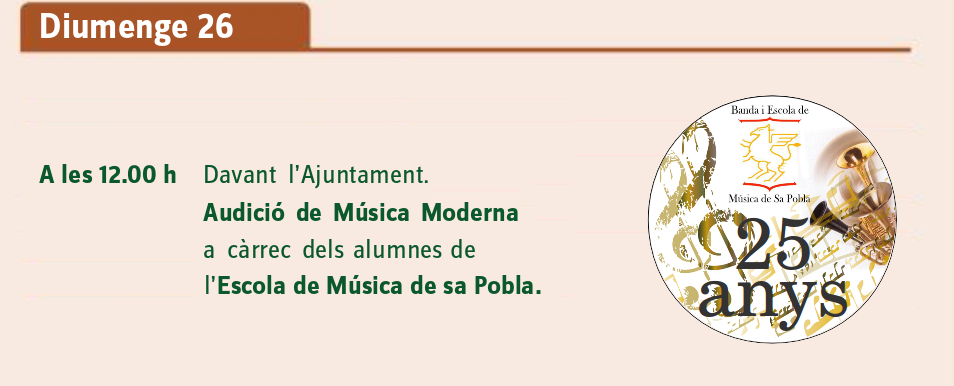 Aquest diumenge de Fira els alumnes de Música Moderna de l’Escola de Música de sa Pobla realitzaran una petita audició davant s’ajuntament.