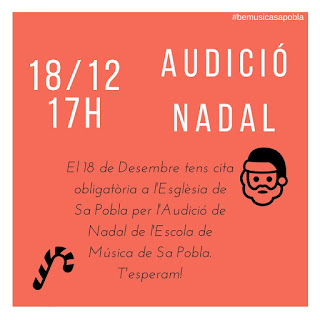 El pròxim 18 de Desembre, t’esperam a l’Esglèsia de sa Pobla per a l’Audició de Nadal de l’Escola de Música de Sa Pobla. Ens trobarem a les 17h per escoltar els resultats del primer trimestre dels nostres alumnes, reflexat en unes peces ben nadalenques.