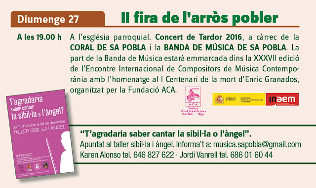 Aquest diumenge dins el marc de la II Fira de l’Arròs Pobler la Coral de Sa Pobla i la Banda de Música de Sa Pobla realitzaran el tradicional concert que realitzam cada any.