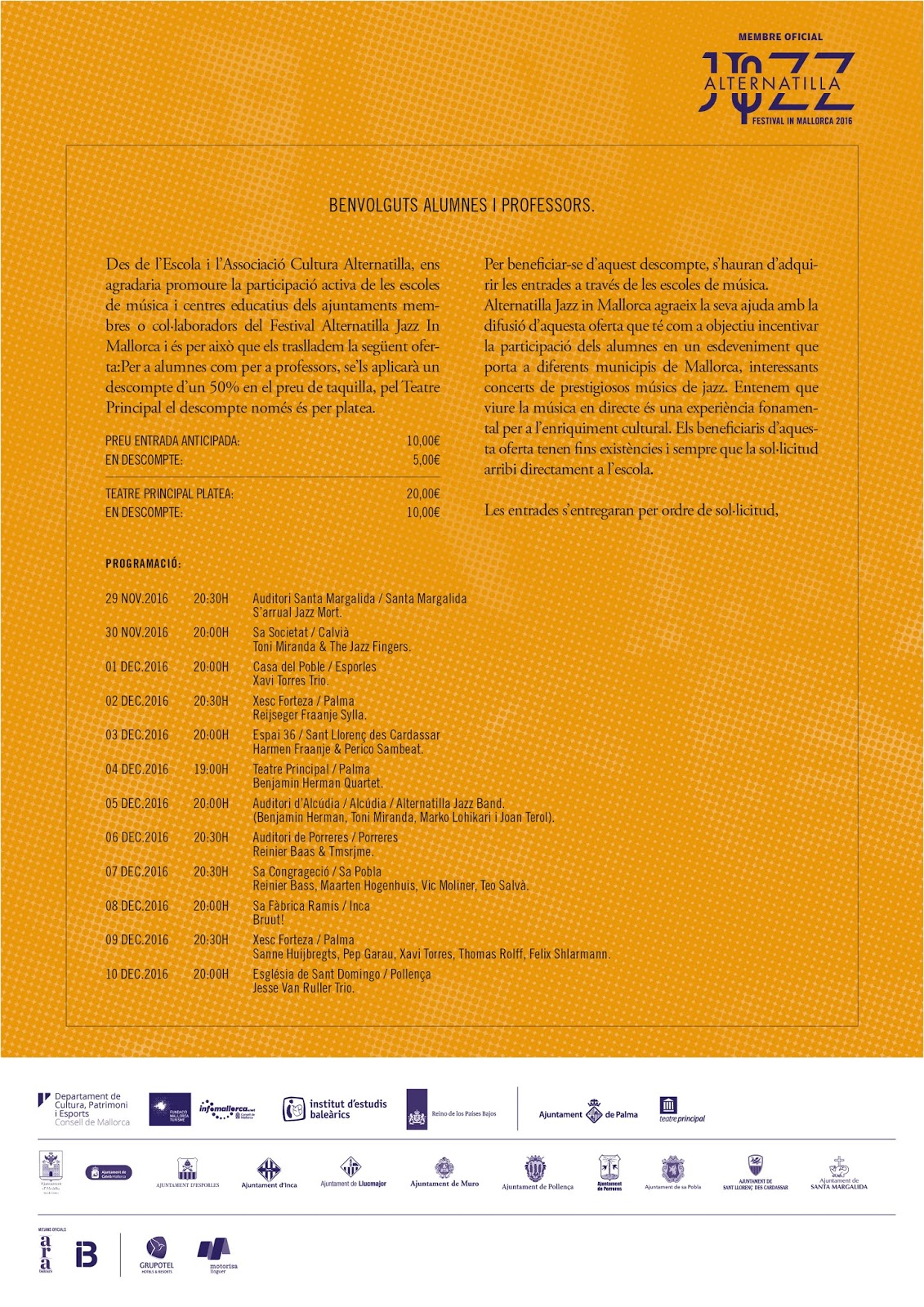 «Des de l’Escola i l’Associació Cultura Alternatilla, ens agradaria promoure la participació activa de les escoles de música i centres educatius dels ajuntaments membres o col·laboradors del Festival Alternatilla jazz In Mallorca i és per això que els traslladem la següent oferta: Per a alumnes com per a professors, se’ls aplicarà un descompte d’un 50% en el preu de taquilla, pel Teatre Principal el descompte només és per platea. Per beneficiar-se d’aquest descompte, s’hauran d’adquirir les entrades a través de les escoles de música. Alternatilla Jazz in Mallorca agraeix la seva ajuda amb la difusió d’aquesta oferta que té com a objectiu incentivar la participació deis alumnes en un esdeveniment que porta a diferents municipis de Mallorca, interessants concerts de prestigiosos músics de jazz. Entenem que viure la música en directe és una experiència fonamental per a l’enriquiment cultural. Els beneficiaris d’aquesta oferta tenen fins existències i sempre que la sol·licitud arribi directament a l’escola. Les entrades s’entregaran per ordre de sol·licitud.»