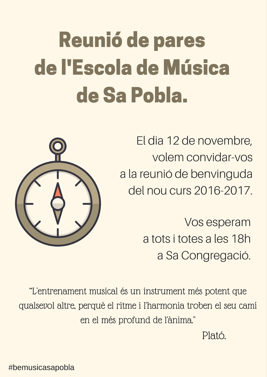 Per començar, la reunió de pares i mares es durà a terme a Sa Congregació a les 18h de l’horabaixa (el dia 12). En aquest nou curs que just acabam de començar, volem fer una reunió de pares i mares diferent, i que vagi més enllà d’explicar com serà el curs. Volem que també tenguin representació en aquesta reunió els valors de l’associació, de l’escola, dels professors i, esperam, també dels pares i alumnes.