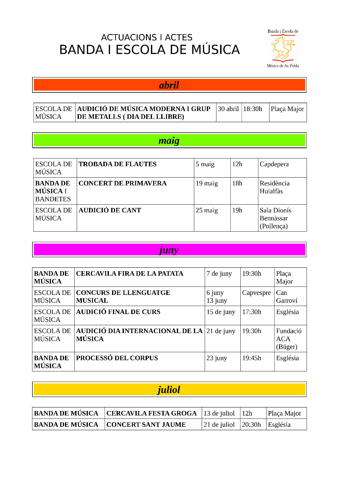 Associació BANDA I ESCOLA DE MÚSICA DE SA POBLA, domiciliada en la PLAÇA MERCAT S/N EDIFICI CAN GARROVÍ (07420 SA POBLA, ILLES BALEARS), amb NIF G07591365, telèfon de contacte: 646827622 i correu electronic musica.sapobla@gmail.com.