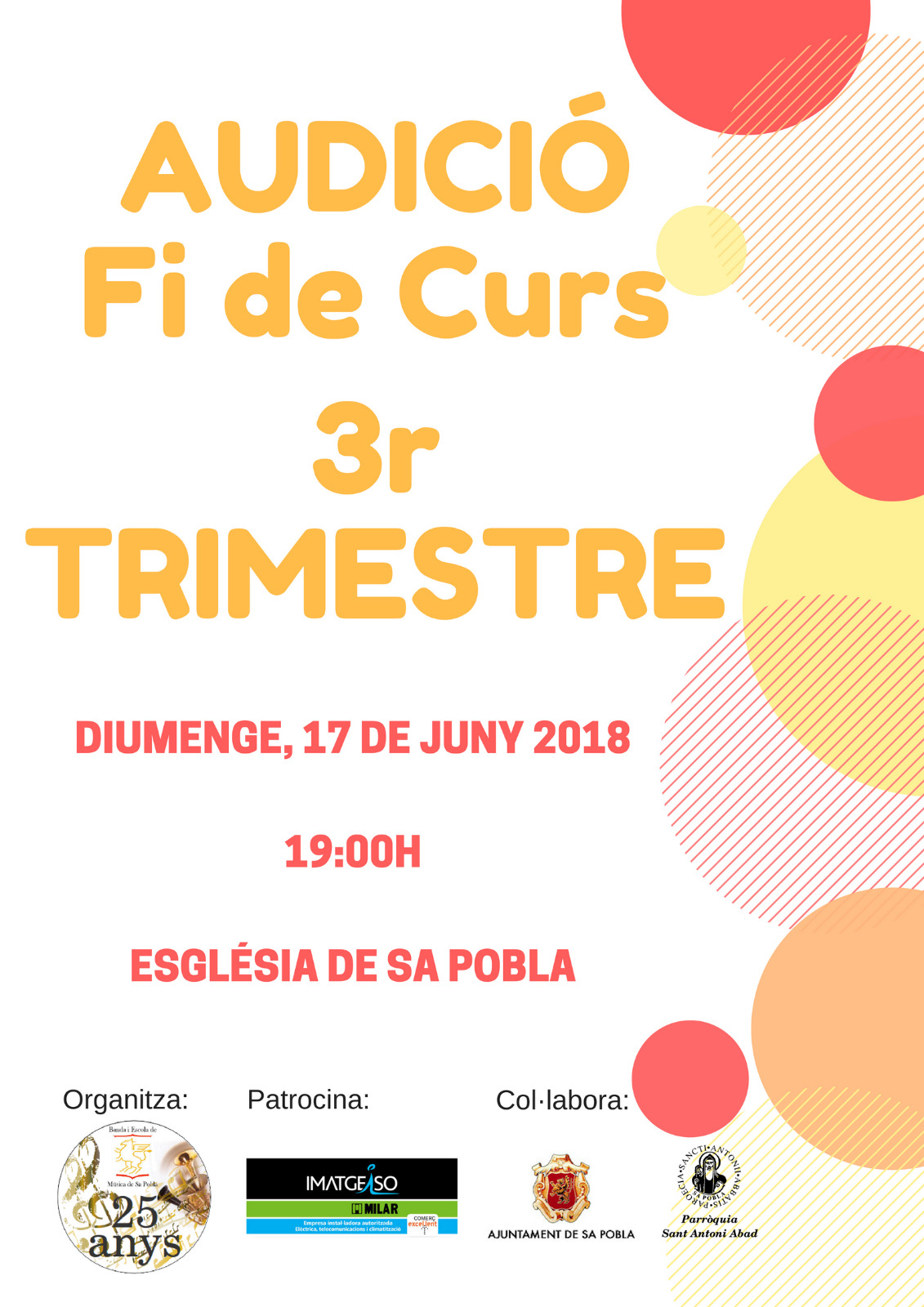 - Dissabte 24 de març del 2018 a les 18:00h, a sa Congregació: audició de Cant, Guitarra i Bombardí.