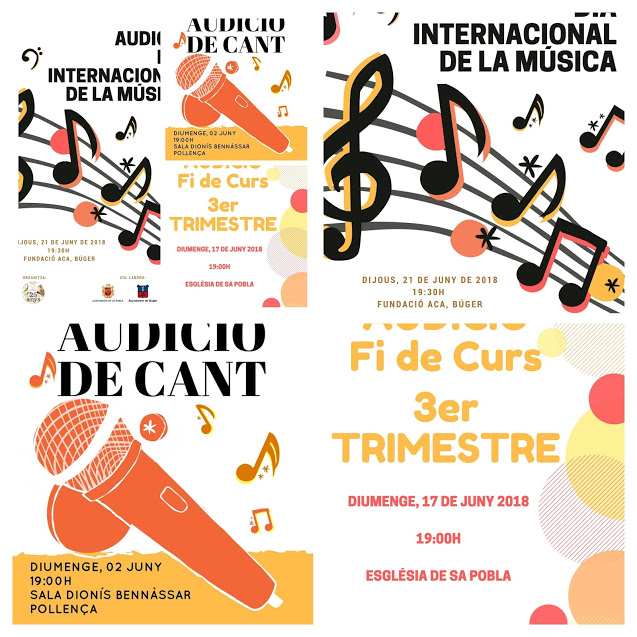 - Al llarg del mes de juny hi haurà una Audició de Cant a la Sala Dionís Bennàssar de Polleça i la Celebració del Dia Internacional de la Música a la fundació ACA de Búger.