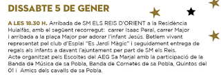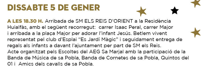 - Per acabar, dissabte dia 5 de gener acompanyarem els Reis d’Orient en la seva visita a sa Pobla.