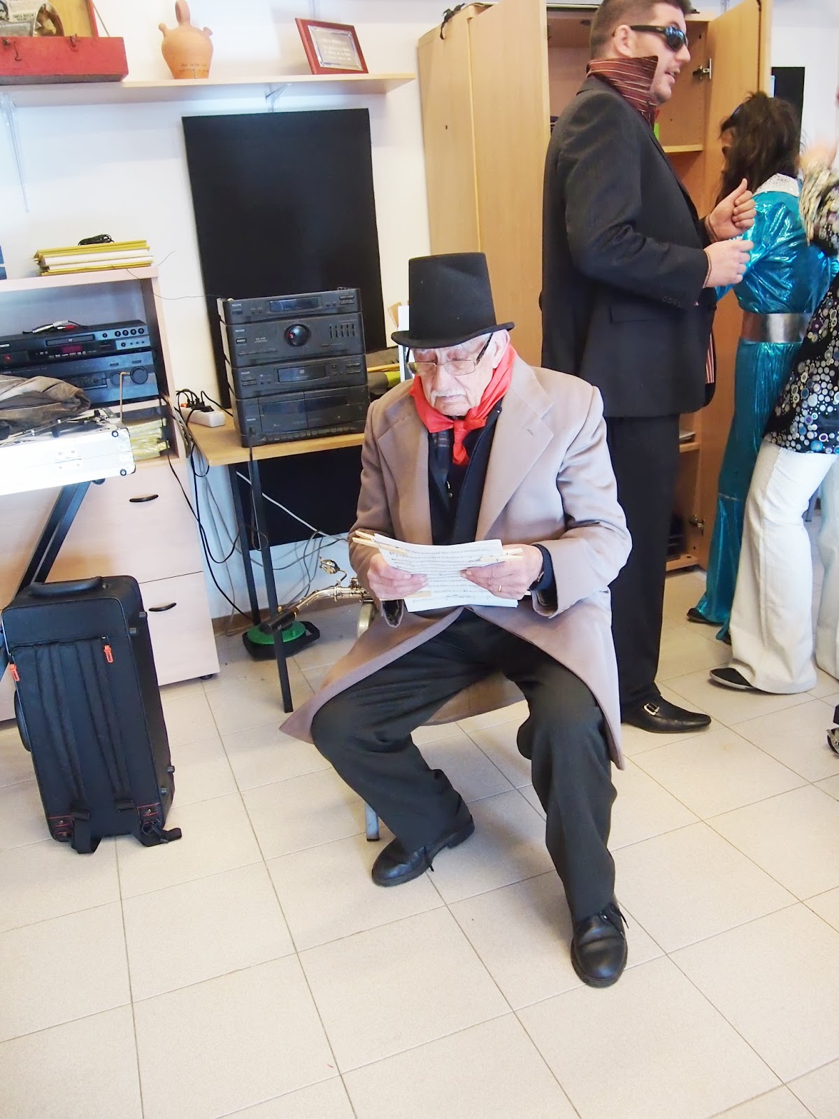 - A la primera foto, esperant el dia de Sant Antoni per acompanyar els caparrots a l’església. I a la segona, el dia de Carnestoltes repassant ses partitures, amb en Joan darrera!!