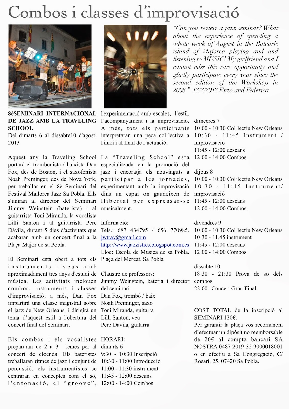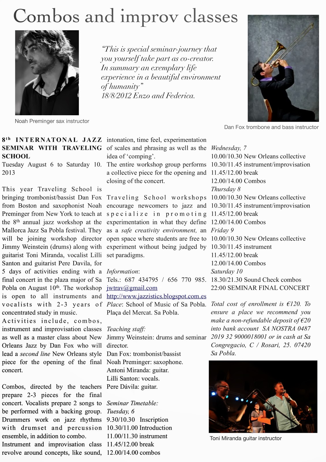 Aquest any la Traveling School portarà el trombonista i baixista Dan Fox, des de Boston, i el saxofonista Noah Preminger, des de Nova York, per treballar en el 8è Seminari del Festival Mallorca Jazz Sa Pobla. Ells s’uniran al director del Seminari Jimmy Weinstein (baterista) i al guitarrista Toni Miranda, la vocalista Lilli Santon i l’assistent Pere Dávila, durant 5 dies d’activitats que acabaran amb un concert final a la Plaça Major de sa Pobla.