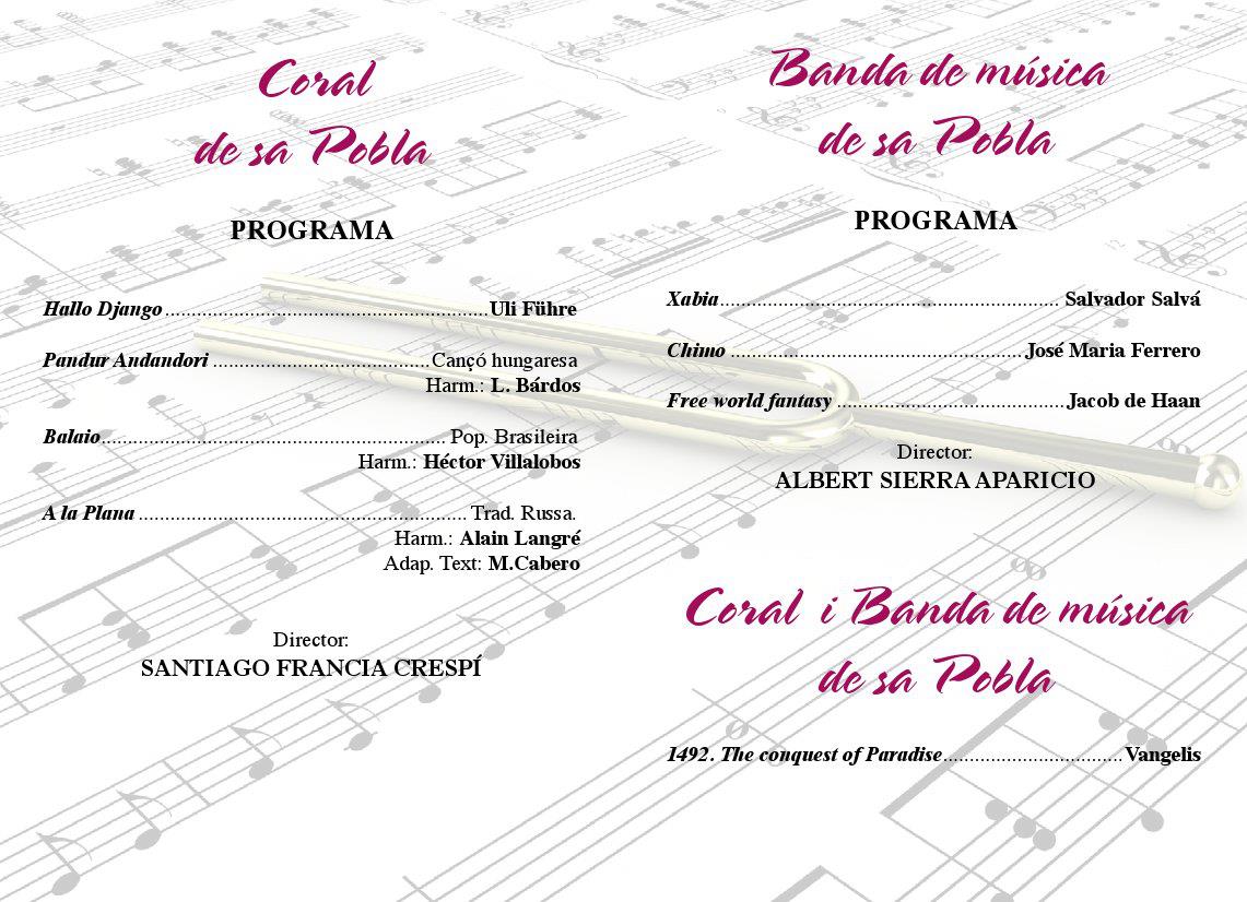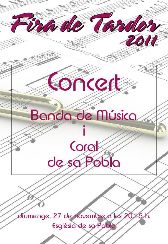 Aquest any el concert serà el diumenge 27 de Novembre del 2011 a les 20:15ha l’Església de Sa Pobla, i ens hem animat a realitzar una peça conjunta amb la Coral de Sa Pobla. Ja feia temps que no realitzàvem cap peça amb la Coral i estam molt contents de haver pogut tornar a realitzar una col·laboració amb ells.